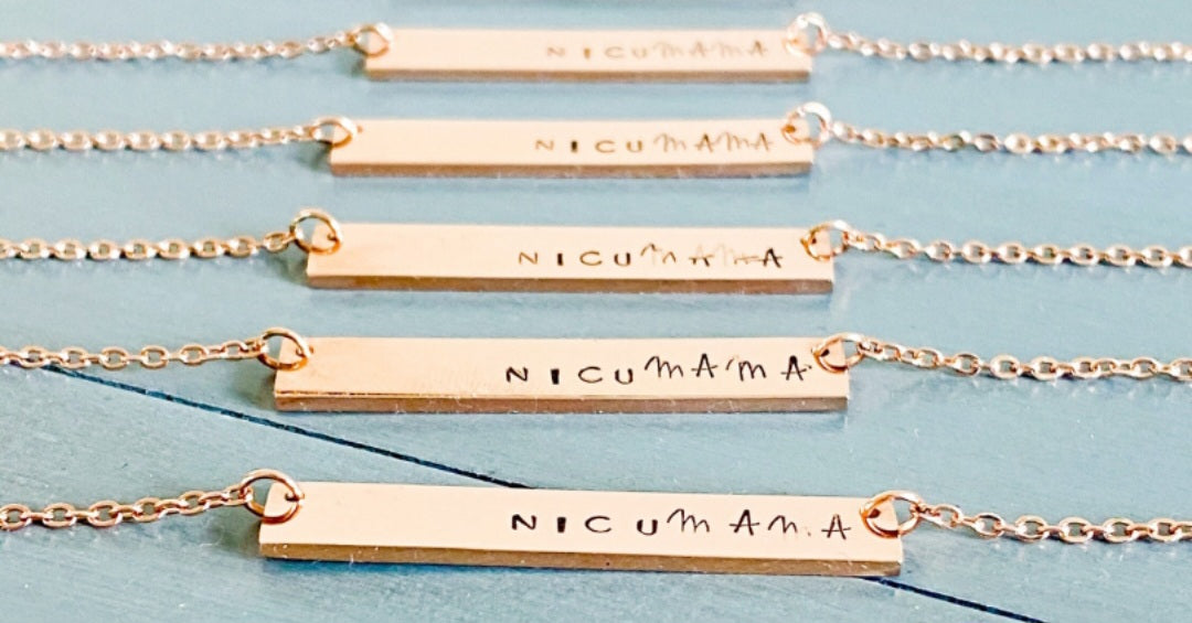 Hand-stamped bar necklace available in gold or silver (both plated stainless steel).